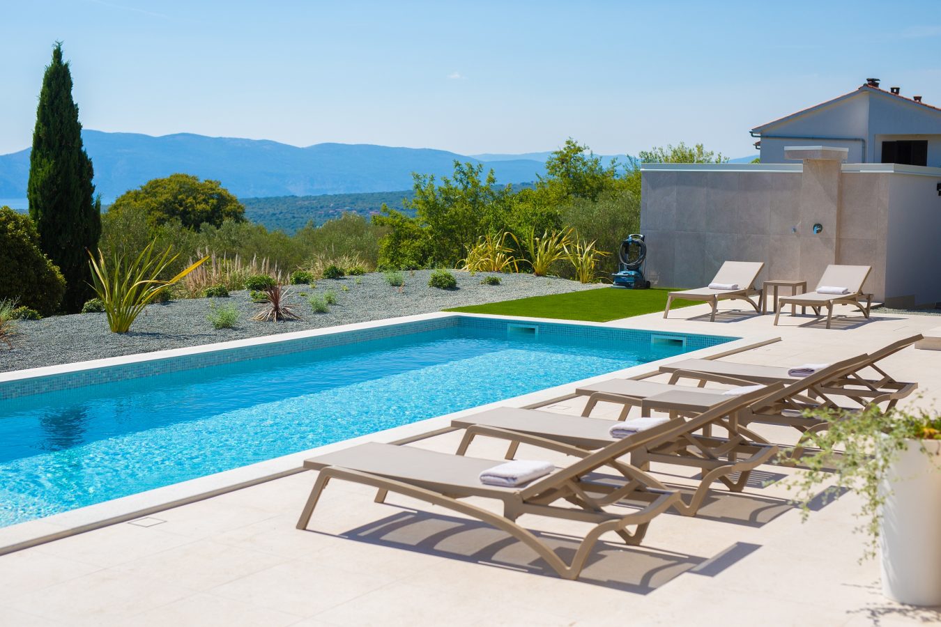 - Villa Olive Garden: U Korniću očarava grijanim beskonačnim bazenom i staklenim stijenkama od poda do stropa koje uokviruju panoramski pogled na Kvarnerski zaljev. Njezini bujni vrtovi i elegantan dizajn stvaraju mirno utočište, dok blizina plaža poput plaže Dunat osigurava lak pristup obali. Idealna za obitelji ili grupe, vila spaja privatnost s besprijekornim unutarnje-vanjskim životnim prostorom.
